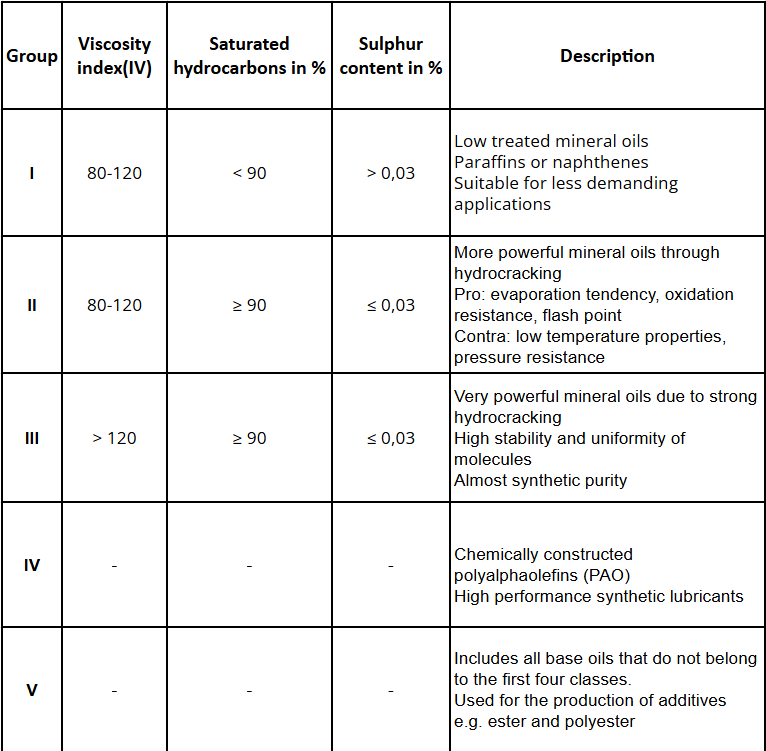 Base oils are classified by the American Petroleum Institute (API) into five groups based on their origin, refining process, and chemical composition. Mineral base oils (Groups I-III) are derived from crude oil through varying degrees of refining, while synthetic base oils (Groups IV and V) are chemically engineered to deliver higher purity, improved stability, and enhanced performance.